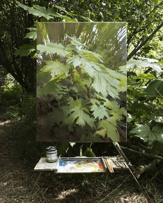 Nicholas O’Leary. Wow. An incredible artist from Bergen, Norway. His use of color is brilliant and there is a clean, crispness to his paintings that is so stunning! This painting is essentially ALL GREEN. How does Nicholas make it stand out? This absolutely amazes me. Every single painting is jaw dropping. His trees are magical and often painted from different perspectives. I absolutely love that. In this image (from his Instagram) you can see the actual setup and the painting. #wow This was painted during a workshop he gave in Alaska.