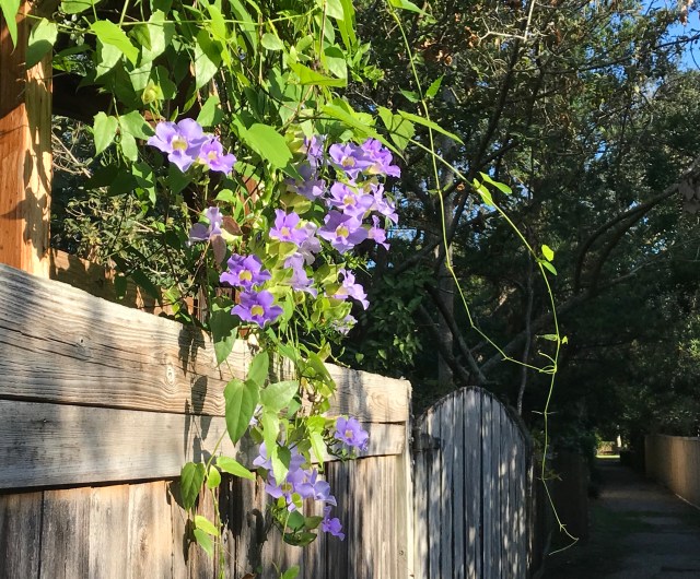 We were on a morning walk in a nearby neighborhood and happened upon the prettiest flowers spilling over a fence. The light was hitting them so beautifully. How could I not stop to take a quick photo? Fred is patient – I know I frustrate him at times because, well, we’re supposed to be walking not photo shooting, but… sometimes (ok, maybe EVERY time) I run across things that deserve to be shared!