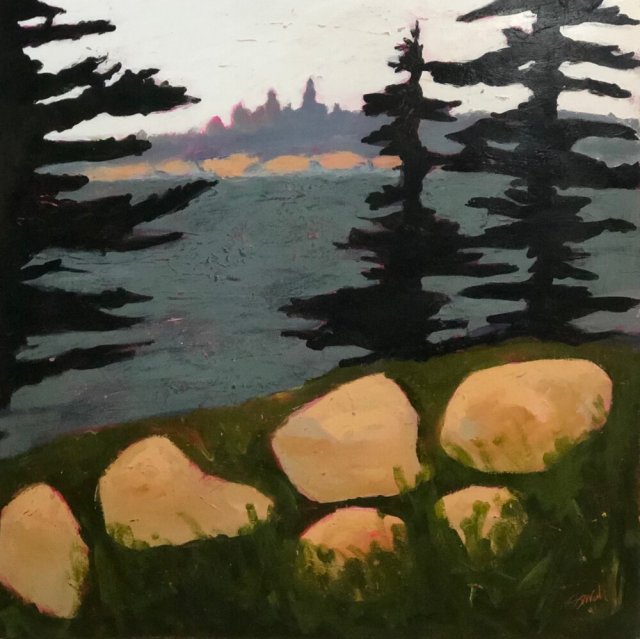 Sarah G. Lee. A wonderful artist from Maine with a unique abstract quality. There is no mistaking the Maine coast, that’s for sure! Those trees! I am fascinated by them!