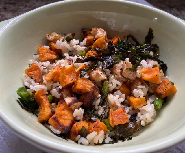 I heated a bag of brown rice (Trader Joe’s) – and added the veg and a sprinkle of cheese (any would work – feta, parmesan, pecorino are all good choices). I put the veggies in a glass storage dish, and heated up the next day with a little bit more rice. It doesn’t take much and you are full. So if you’re busy, spend one day roasting your veggies and you’ll have quick meals during the week! Use whatever veggies you like.