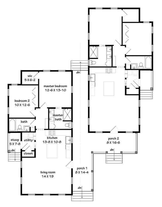 The Duplex (SL 2014) by Moser Design Group for Southern Living! This plan is a duplex (two residences) – each is 1,055 square feet with 2 bedrooms and 2 bathrooms. I LOVE the idea of this duplex. It affords privacy (separate porches and front entries). This plan is perfect to live on one side and rent the other, or how perfect for your parents, sibling, friend, etc.??!! That way you each have your own space but are there for each other. I LOVE THIS CONCEPT!