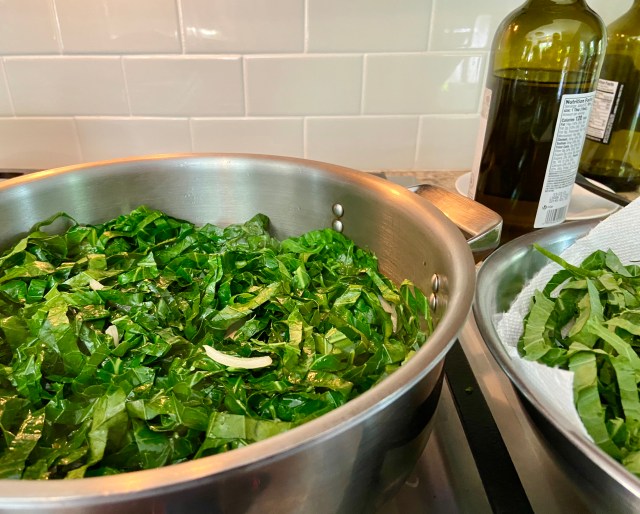 * Be sure to clean the collards well – they can be sandy and you do not want to bite into grit 😬 I fill up a large pan with cold water – I rinse each leaf front and back and rub it with my (clean) hand, then put it in large pan of water. I do this for each leaf (the most time consuming portion of this recipe) – I swish the leaves around then dump the water and do it again, if you feel or see any sand, keep doing it… then to a colander, then to a clean towel with paper towels to dry. (It’s worth the effort!)