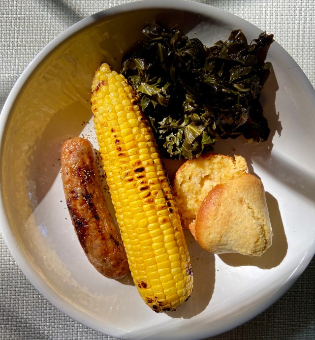 I had some Al Fresco Chicken Sweet Italian Sausage in the freezer – so Fred grilled it along with the corn, and I made “Jiffy” (not the package) corn muffins – nothing but real ingredients in these corn muffins. What a treat!