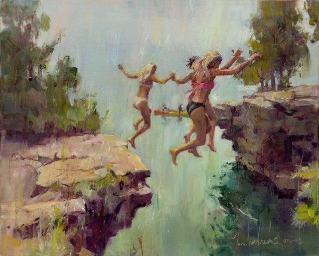 Tom Nachreiner – stunning paintings! Sometimes it’s tough to choose just one image… I had my heart set on Sunrise Mist – I mean, whoa a beautiful sunset, a magnificent tree… what’s not to love, right? Then I saw Jumping BFF – and it took me back to another place and time. As kids we used to jump into the river all day long. Literally. While the river was not off of a cliff or rock formation seeing these figures jumping is exactly what we used to do. I love the bit of abstractness to the water and background while grounding the painting so you truly know what’s going on. This is fabulous!