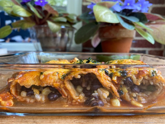 NOTE: I used whole wheat tortillas (recipe doesn’t give a size, but I’m pretty sure they’re the smaller ones, I grabbed the first pack of whole wheat that I saw not paying attention to the size. They’re big. It still (easily) made 8 (giant) enchiladas, but when I placed two on my husband’s plate, the heft made my eyes 😳 ha ha. It’s all good. Black beans, rice, frozen corn, a little cooked brown rice, jalapeño, fresh cilantro, a little enchilada sauce and a handful of cheese. On the side I added a little brown rice as suggested, Greek yogurt and avocado – those items were really awesome with this dish – I also made some pico to go along with as well. I had one, along with a spoonful of brown rice, and the toppings and it was plenty. I had 1/2 another day for lunch and it heated beautifully!