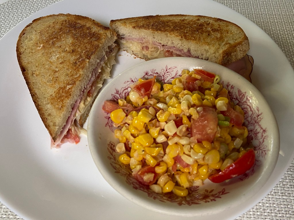 Is there anything better than a great grilled sandwich? The answer is “no” when you really need something different. I am a creature of habit. So most days I have an apple, a few tablespoons of peanuts, sometimes a few Wheat Thins, some grapes… then later a small amount of popcorn. It works well for me but sometimes you just really want a lunch. Not a puny lunch, but a real LUNCH. Haha… this is where this comes in. I made a batch of roasted corn salad the other day and it was enough for three meals for us. This salad is out of control good. My absolute hands-down-favorite!