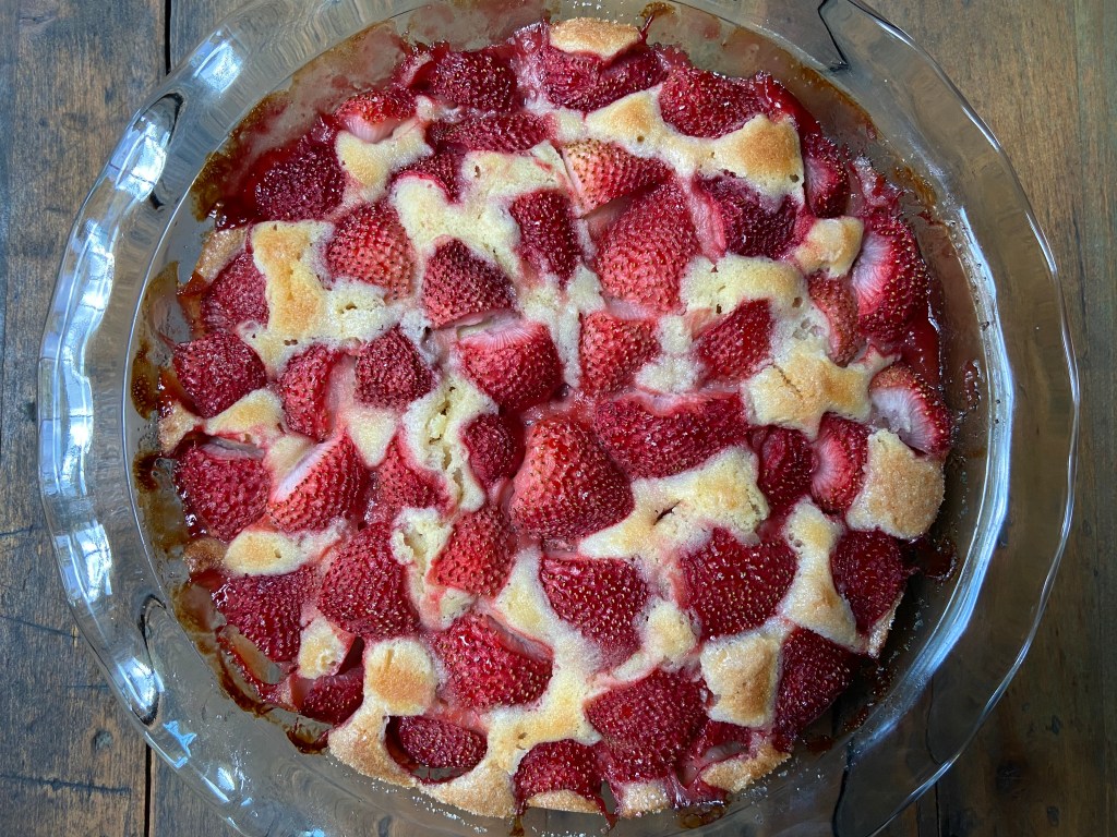 Deb Perelman, the woman who writes the fabulous blog, The Smitten Kitchen can come up with the most mouth-watering recipes. Every single recipe that I have tried has been out of this world! I signed up for her newsletter which is full of inspiration and recipes… Recently, there was a recipe for a sheet cake size Strawberry Cake that was based off of the Strawberry Summer Cake original recipe (shown above). Since there are only two of us, and with the Coronavirus floating around, no company in the foreseeable future (if ever, or so it feels) – a 9″ pie plate size cake sounded just right! She adapted this recipe slightly from Martha Stewart. I look so forward to trying Deb’s version with the barley flour/flour mix!