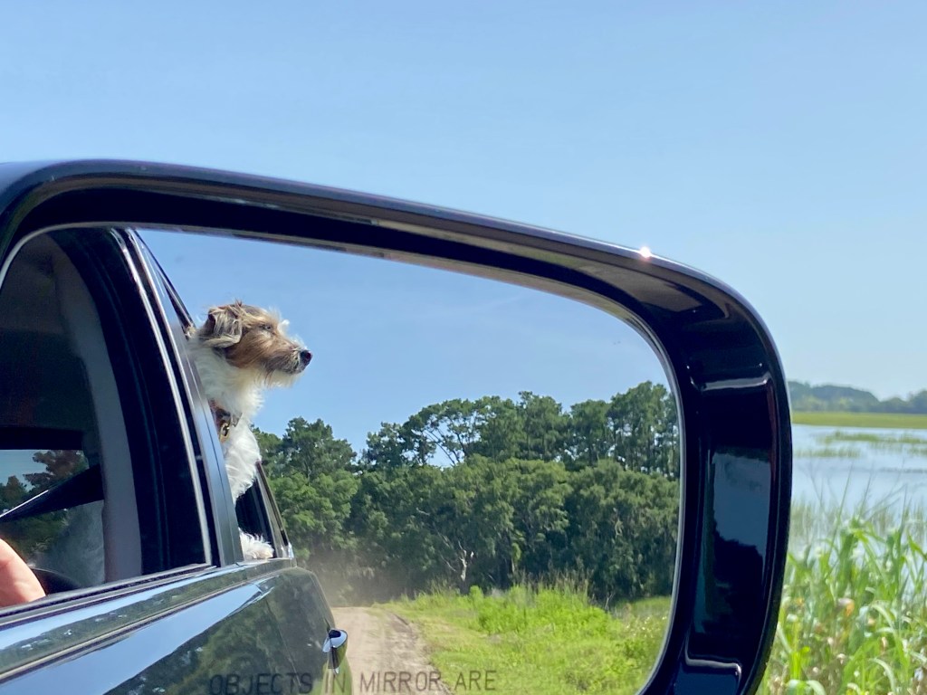 Oh, the places we will go! Sounds similar to a Dr. Seuess book. I love the look on Charlie’s face – he’s taking it all in and absorbing every possible scent. He was in heaven! The dirt road in the rearview mirror, the marsh off to the side. We live in such a beautiful area, with another STUNNING area to get to in no time!