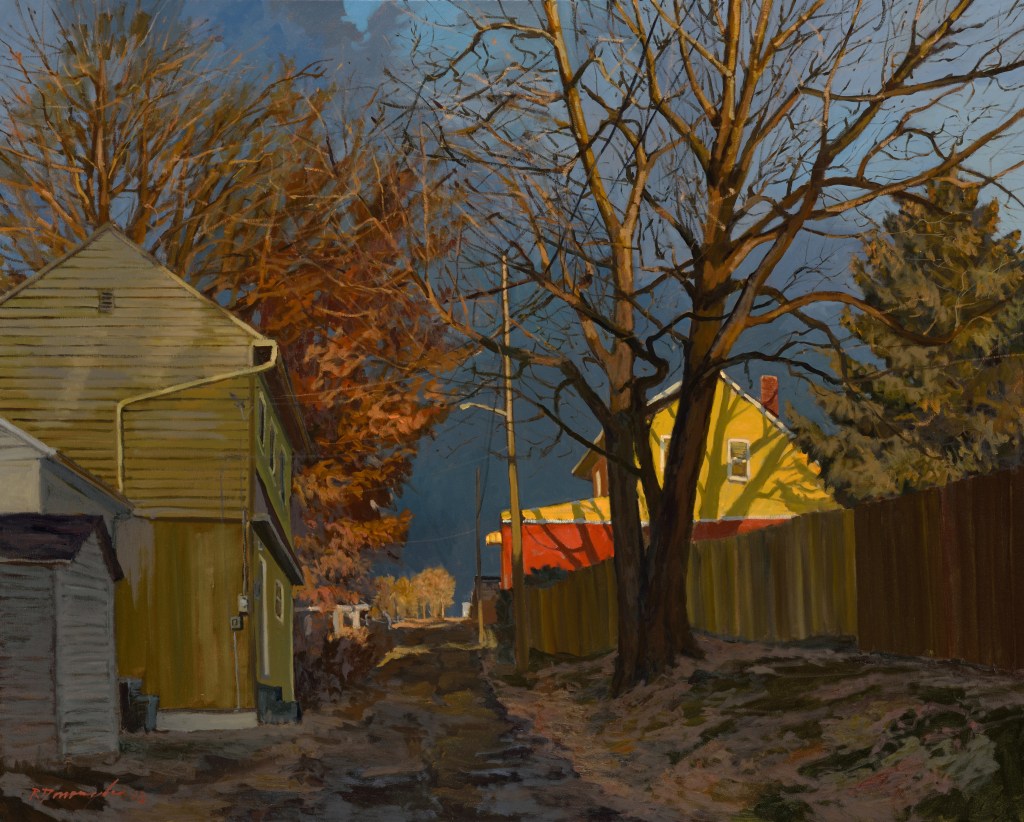 Painting from life has become a ritual for me, but it is also my work. Every day I go somewhere to make a painting without knowing exactly what will happen. Because I have no preconceived idea as I set out, my subject matter is unlimited. I might choose to paint a scene on the basis of light and shadow, or because of the feeling I get when I see a lone building at the top of a hill. I do not seek postcard scenes; I seek an intensity of feeling that comes only from being in a particular place at a particular time. So many things in the landscape are interesting, especially here in Western Pennsylvania: steel mills, city skylines, snow-filled parks, twisting side streets, and even back yards. For me, it is a painter’s paradise.