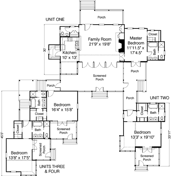 This plan is divided into four units. Unit one contains the master suite in addition to the kitchen and family room. Unit two is off by itself. Units three and four are hooked together yet still entirely separate. Everyone has their own space, yet they can all get together. How nice would it be to take turns cooking? Have fires outside with comfy chairs, inviting conversation and memories being made by the millions? Are you trying to find a way to bring a few families together, or do you have grown children that visit often -This is perfect, right?