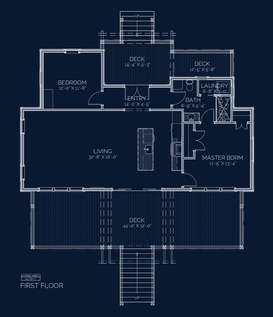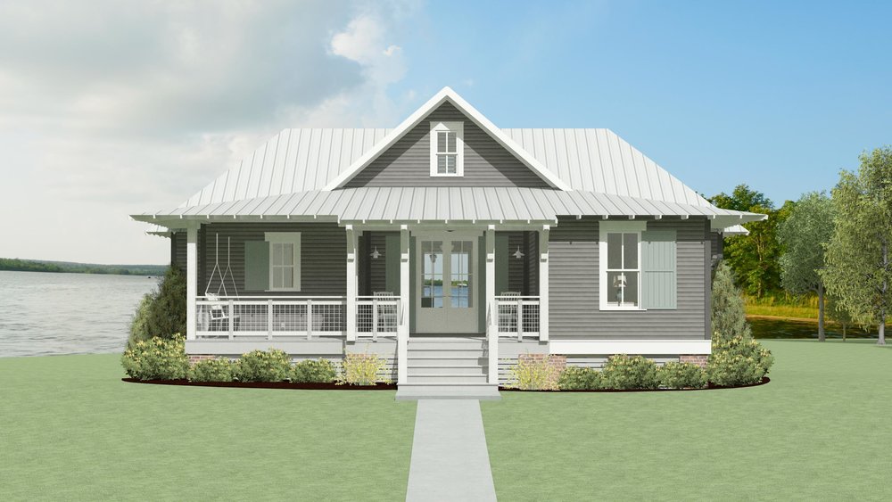 This is the Pickens Retreat house plan by Lake and Land Studio. This plan is 1,117 square feet with 2 bedrooms and 1 bathroom. It’s an open kitchen/living plan – See more images of the interior HERE – you’ll see that it does fit a dining room table comfortably – if you need it in addition to the fabulous island!