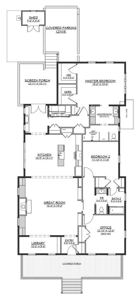 Fabulous, right? A wonderful front porch – a nice size entry with closet, a library on the front of the house – I can’t tell you how much I love this idea! The other side in the front is an office area or a 3rd bedroom – I love the options that this presents! A great room that isn’t in full view of the front door, which is a great idea – that opens to the kitchen. Another bedroom, bathroom, master suite (with TWO closets!!), a washer/dryer and mudroom area, a screened porch, and covered parking.