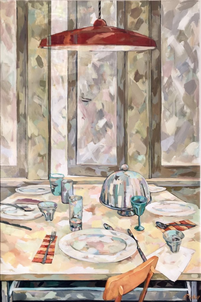 I enjoy paintings of tables in use, also known as a tablescape. They can be as busy or as simple as you like. Whether there are people included or not – they’re interesting. Check out this artist from Canada!