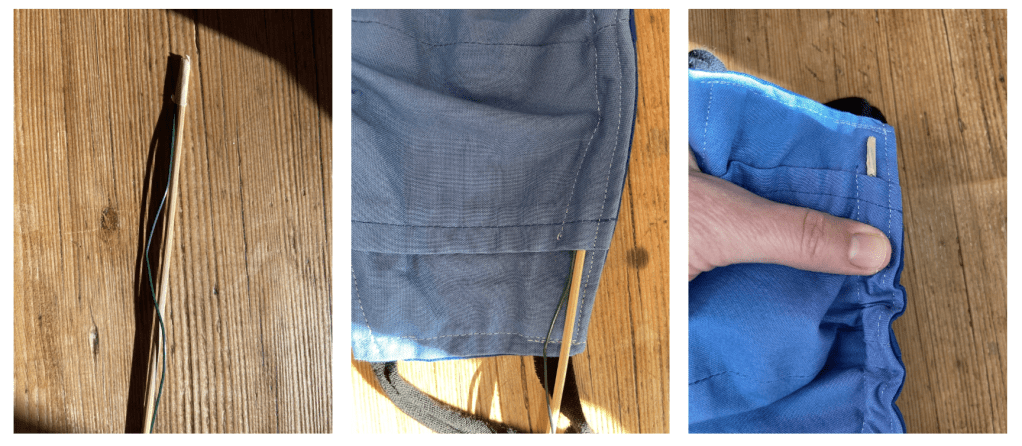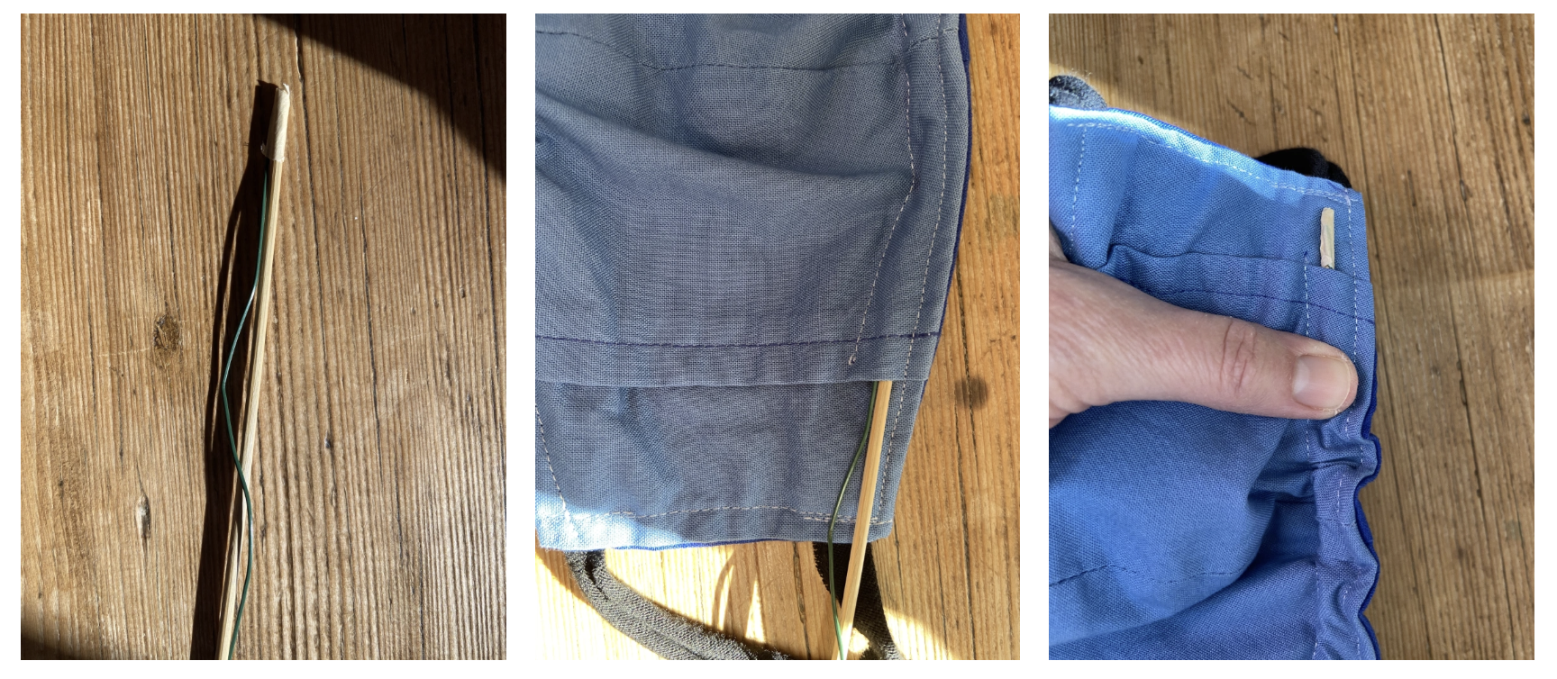 I was having a heck of a time getting the nose piece back into the mask. I found a way! #icanbelikemacgyver (remember that show?) So this was fun. I took a wooden skewer (for the grill) and I taped the wire to the end of the skewer with masking tape. I fed the skewer through, once it popped off the other side I removed the masking tape and pulled out the skewer. #easypeasy It took a few seconds vs. my first attempt at trying to get it to go through and it wasn’t budging. #woohoo