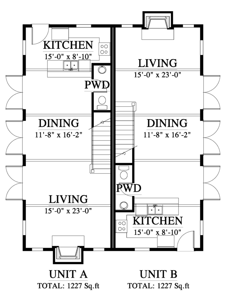 This is a townhouse plan. Unique, and can be absolute perfection in so many cases. The floor plans are flip flopped for each. You enter via the front door for the plan on the right, walk into a kitchen, dining and living space. For the left side, you enter via the back, and into the same rooms. Which means the living area is in the front of the plan on the left and the kitchen is in the front of the plan on the right. I really like seeing only one door. Both are two story.