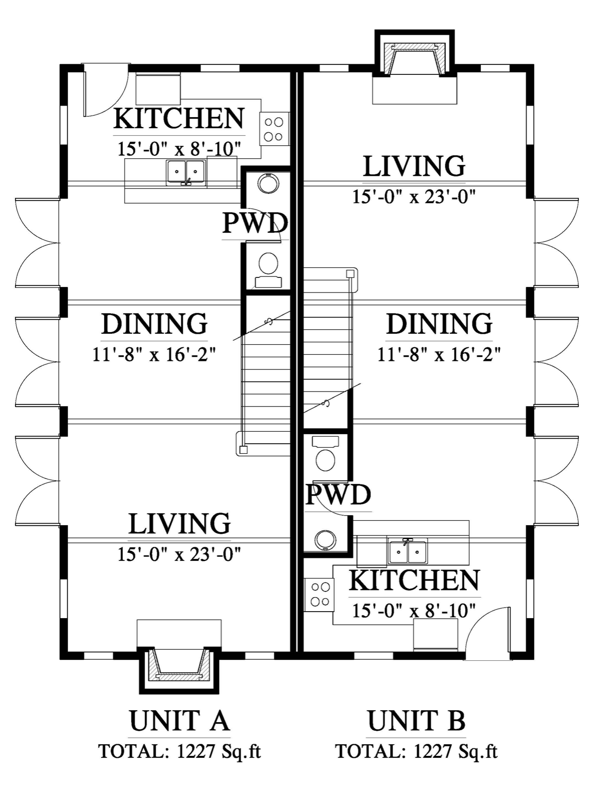 This is a townhouse plan. Unique, and can be absolute perfection in so many cases. The floor plans are flip flopped for each. You enter via the front door for the plan on the right, walk into a kitchen, dining and living space. For the left side, you enter via the back, and into the same rooms. Which means the living area is in the front of the plan on the left and the kitchen is in the front of the plan on the right. I really like seeing only one door. Both are two story.