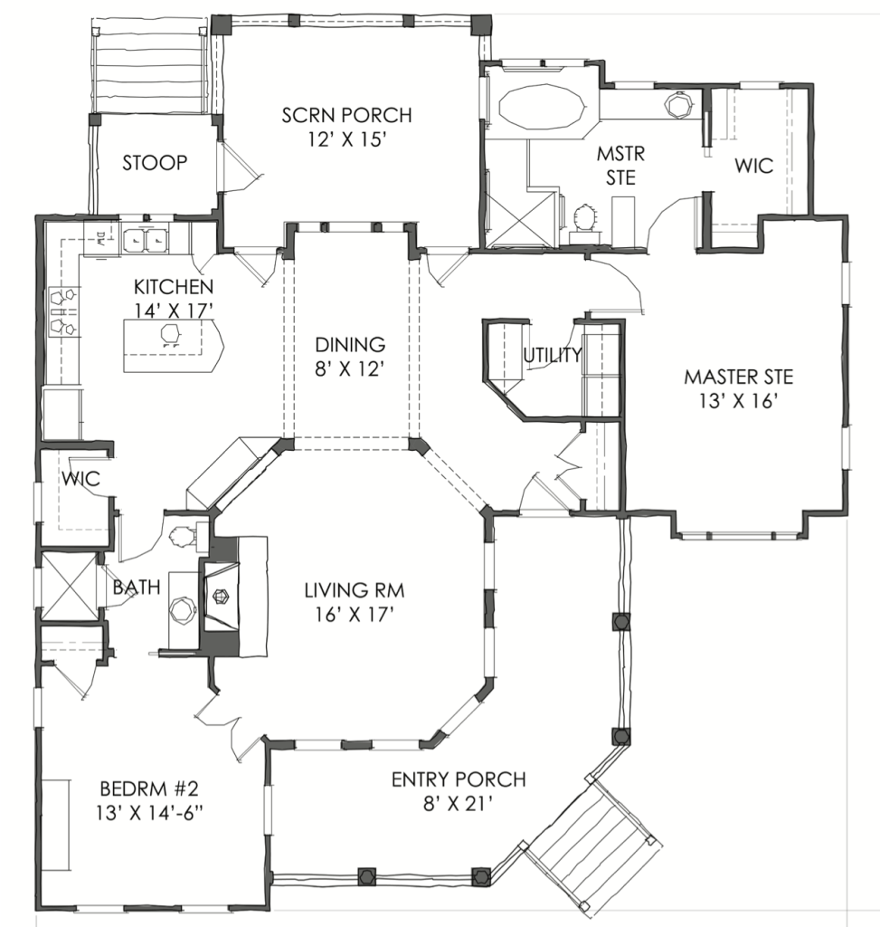 This is the Humbert Way house plan (also known as TNH-B-10A) by Moser Design Group. This plan is 1,471 square feet with 2 bedrooms and 2 bathrooms. This plan looks much larger to me. It shows you that if a plan is well-designed, you don’t need umpteen thousand square feet to live well.