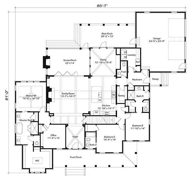 There is a generous front porch that leads to an elegant foyer. This plan has so much. An open kitchen/family/dining room. A rear porch and a rear screened porch. Wow.
