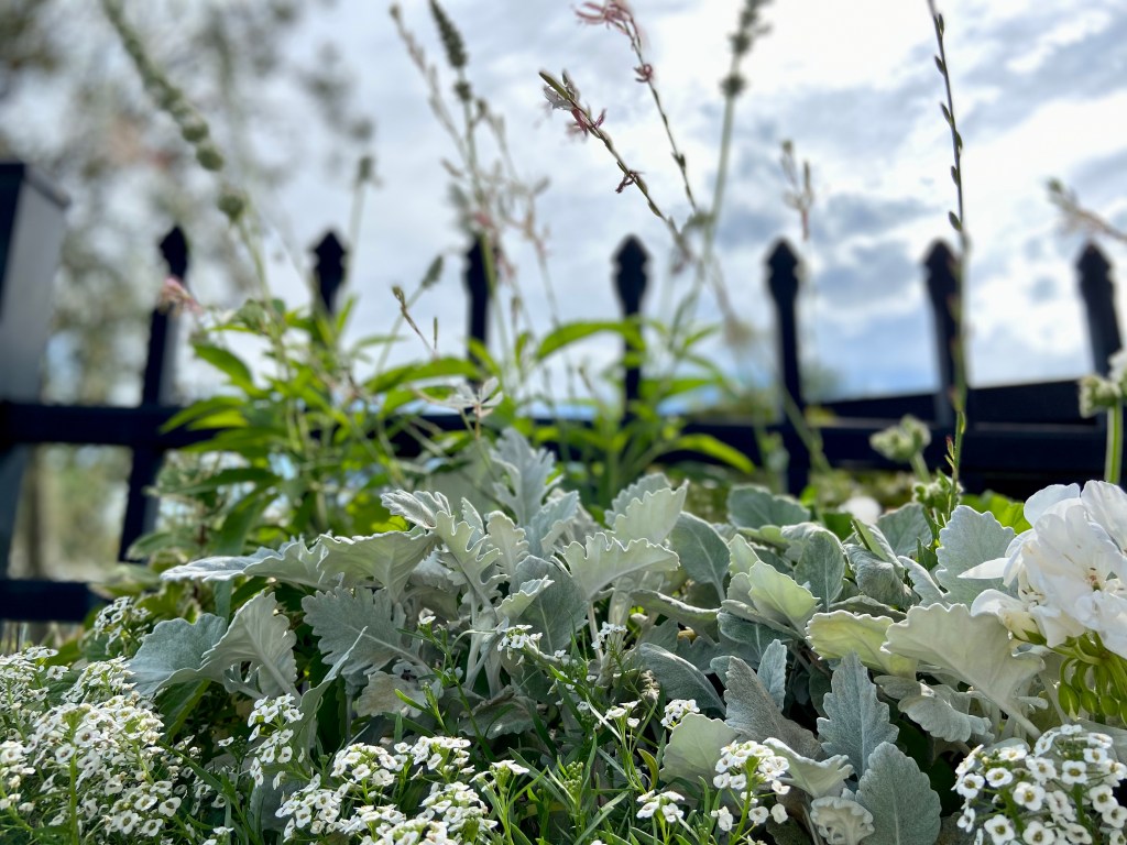They’ve only been planted a week and are getting stronger, taller and fuller already! The 3′ flower box (it’s really wrought iron with a coconut coir liner) holds an amazing amount of dirt and plants. I really didn’t think we’d get them all to fit, but we did, and it’s spectacular! It makes me smile every time I see it. Now we can see it when we walk in the room, since it’s growing like crazy and is now in full view. Woohoo! Keep your eye out for plants that you enjoy, color schemes that you like and that work with your house. Ours is darker brick, so I thought lighter colors would stand out a bit more, except the dark purple of Archangel. It’s stunning!