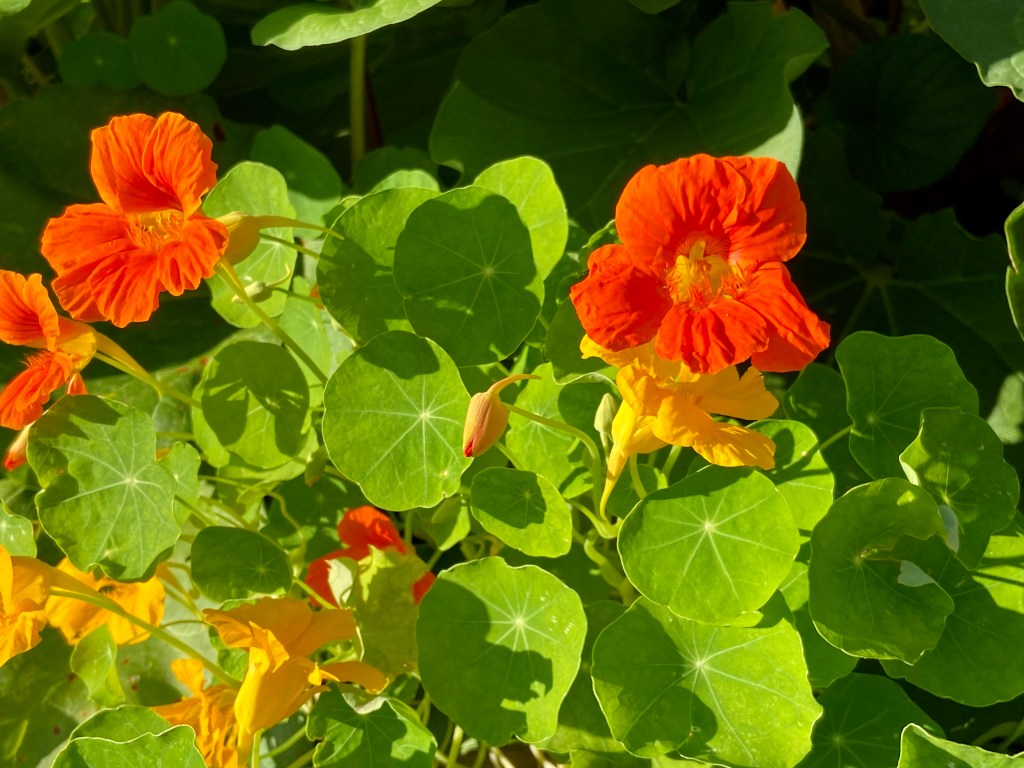 Nasturtiums are a favorite for so many reasons. Their vibrant color is a big draw, so striking against the green leaves! I didn’t realize how good they smell until my mom pointed it out the other day when I was visiting. Nasturtiums are also edible. I have had them on my plate several times in a nice restaurant but I didn’t eat them.