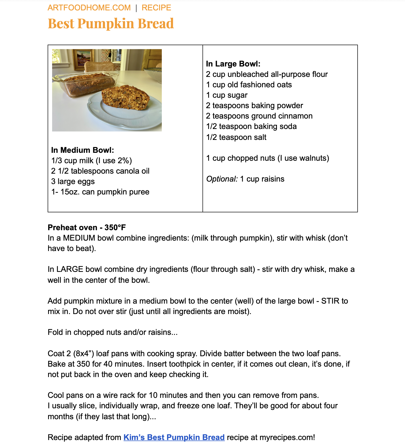 This recipe is my adaptation of Kim’s Best Pumpkin Bread recipe on MYRECIPES.COM – I started making this pumpkin bread back in 2000. This was in the low-fat era, so I’ve made some changes. This is my current version (click HERE to print the recipe as shown below):