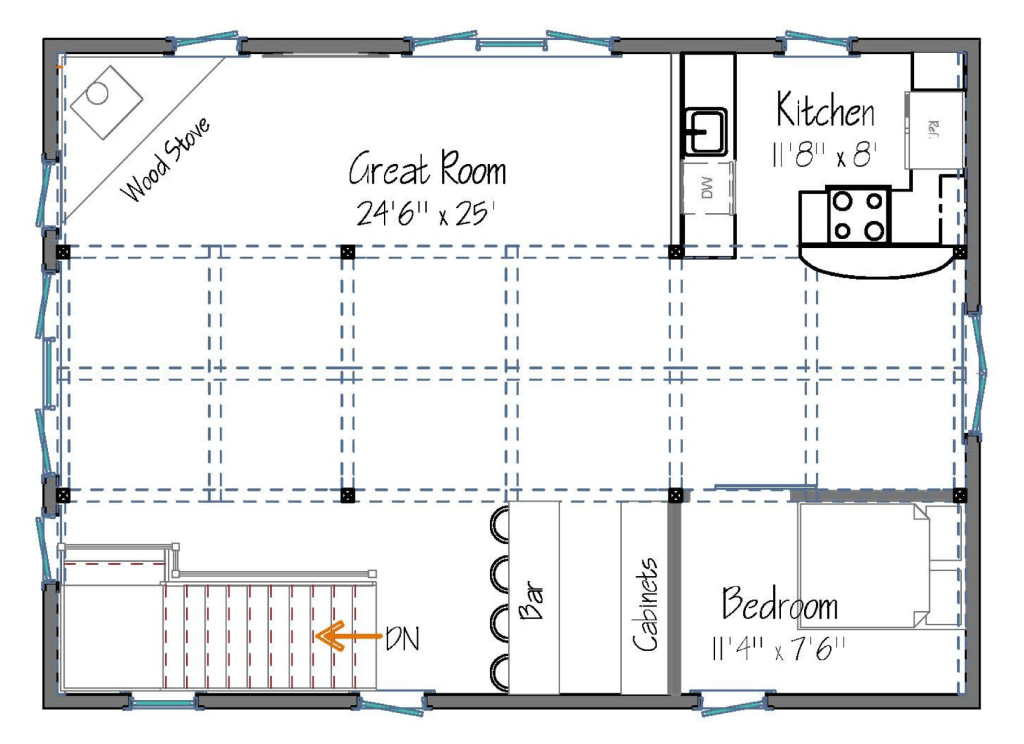 This is the Edgewater Carriage house plan by Yankee Barn Homes. This plan is 1,050 square feet with 1 bedroom and 1 bathroom. It’s a spacious (for its square footage) plan that is absolutely exquisite! When you click on the house plan link, you’ll see real images. One looks like a stall that they made into a bunk room. I absolutely LOVE this idea! The bathroom and washer dryer is located on the first floor.