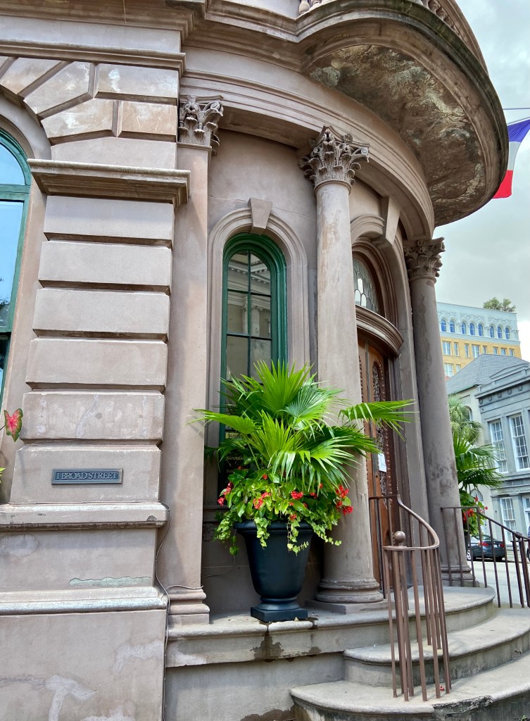 This is one gorgeous building. I’ve loved it since I first saw it in 1988. Stunning architecture and so much history! This is One Broad Street – it’s in the heart of the Charleston, SC peninsula. There is so much history in this area, and this building is no exception!