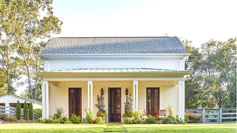 I think this is such an interesting house plan. It’s intriguing and unique. Gorgeous doors across the front, they pull you right into the space. I love the porch, no spindles, barely a step up, which is great. A very classy design for sure, and just wait until you see the inside! Wonderful porches front and back!