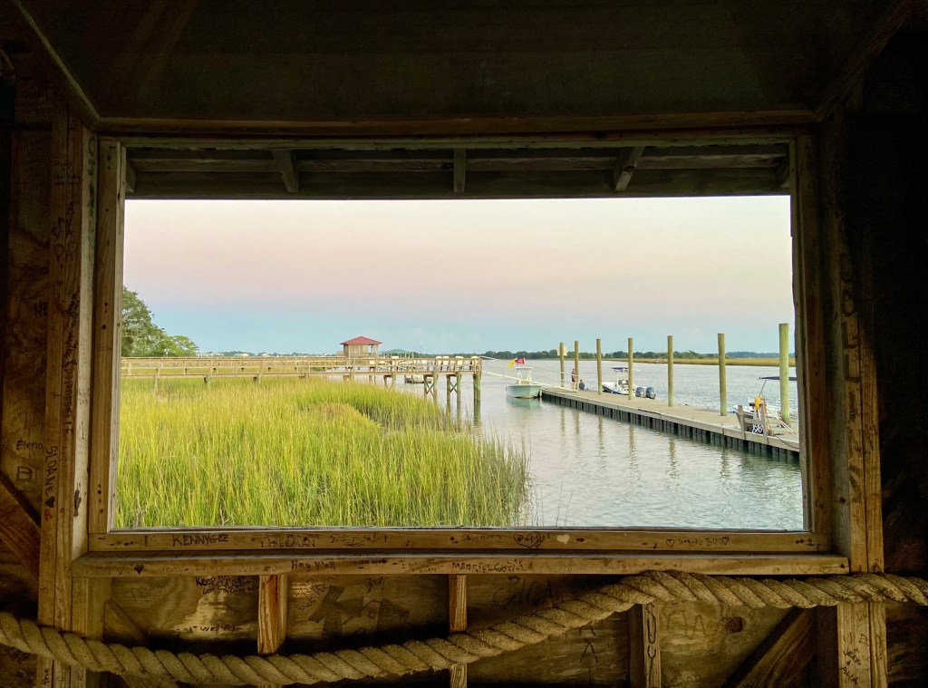 I love to take this photo (have taken it in the past)… we were at Bowens Island back in October, the sun was setting as we were finishing dinner. I had my phone with me and snapped a few fabulous photos. (How could they not be fabulous when the setting is literally jaw dropping)? The marsh grass, the trees, the sunset, pure heaven!