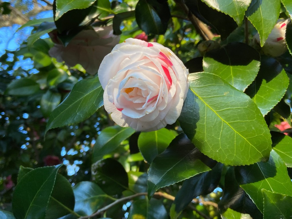 Camellias are blooming in Charleston, SC right now and they’re gorgeous. Many people cut the blooms and float them in a shallow bowl of water – very pretty. I love the shiny leaves, the tight compact buds and the exploding blooms that are so beautiful.