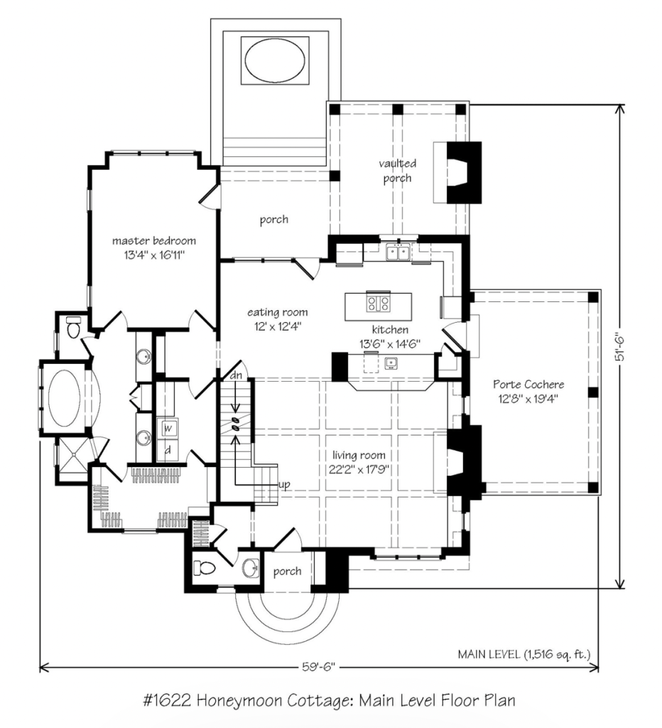 This is the Honeymoon Cottage by Mitch Ginn & Assoc. – this plan is 2,504 square feet with 3-5 bedrooms and 3.5 bathrooms. I love the deep inset door (ahhh! the door!) and the fact that you have a porch in case it’s raining. It also helps to protect the door. You enter into the living area, on the left is an area where you can access a closet and a powder room, out of sight, which is classy and keeps the look clean.