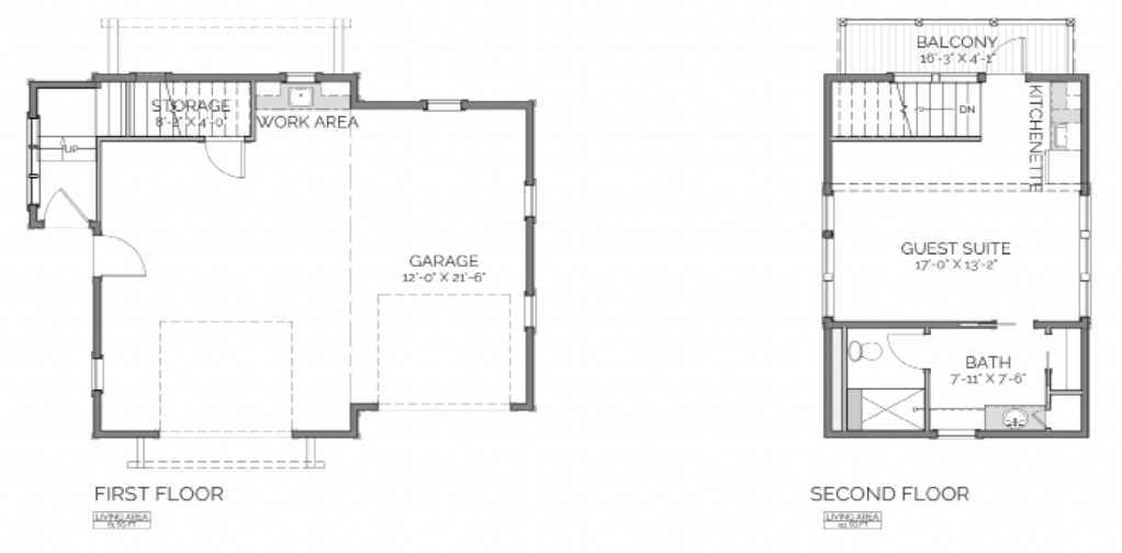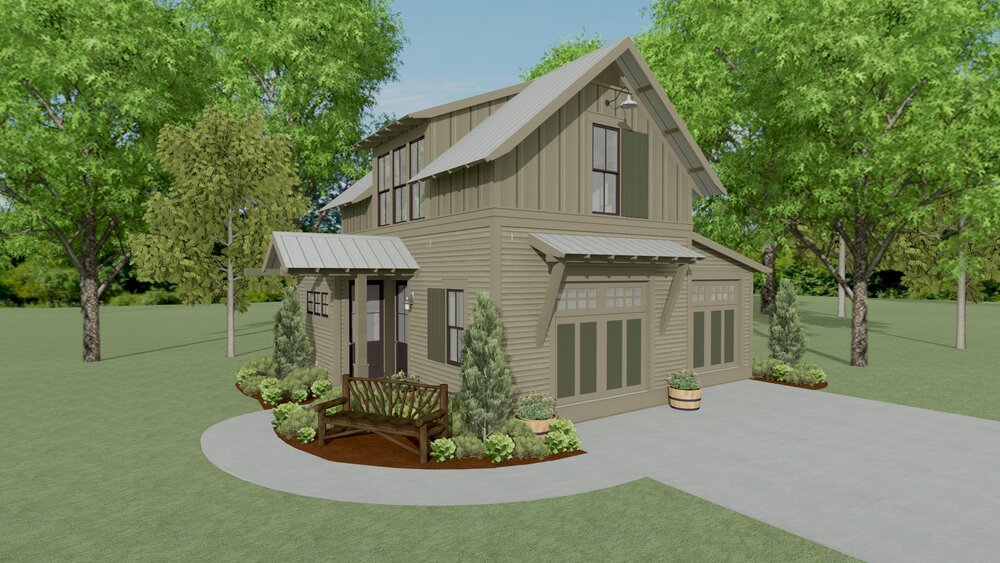 This is the Bay Springs Carriage House by Lake & Land Studio. This plan is 472 square feet of conditioned space, as well as a 2 car garage with work space – click the links to see more details (including details on square footage) on their website!