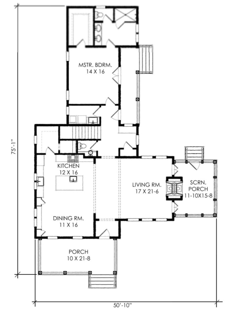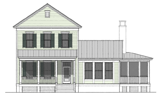 I’m all about a nice porch and there is a nice size porch on the front of this home – as well as a fabulous screened side porch (as I mentioned earlier) – that alone makes this plan a winner to me. When you enter this plan there is an entry space followed by an open kitchen, dining, living area. Each space is generous in size. If you walk straight past the living areas there is a powder room, stairs to the second story and a wonderful master bedroom. In the bedroom, I like that the closet is on one side and the bathroom is on the other (vs. a closet inside a bathroom). There is also a side/back porch – which is quite wonderful!