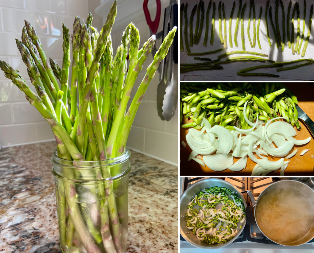 When pasta has about 10 minutes before it’s done, heat a large skillet – once warm, add olive oil (1-2T). When you see it start to shimmer, drop in the asparagus and onions, cook on medium heat stirring occasionally while the pasta cooks. (Optional: when pasta is almost done, using a large serving spoon, scoop out a spoonful or two of pasta water into skillet and give it a stir).