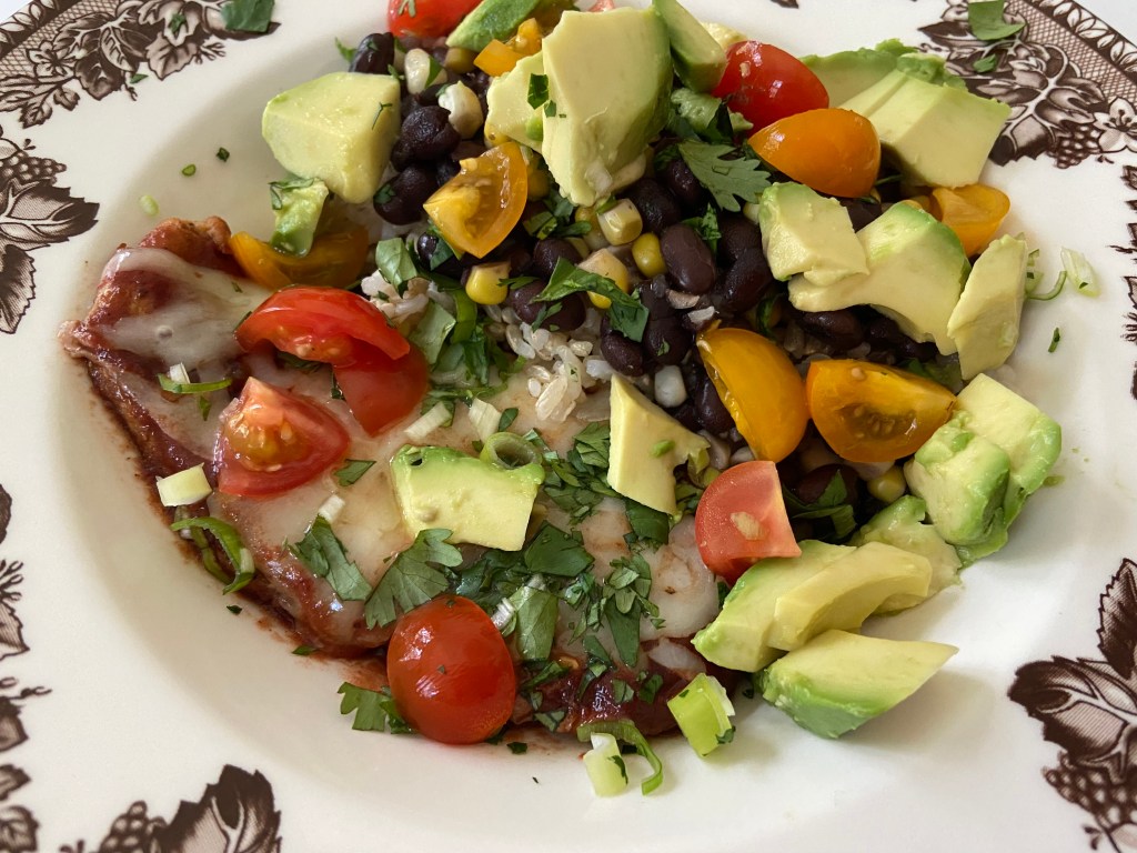 To serve, add your chicken to a plate or bowl, a scoop of brown rice, black beans and top the entire bowl with tomatoes, avocado, cilantro, green onions and a handful of blue tortilla chips.