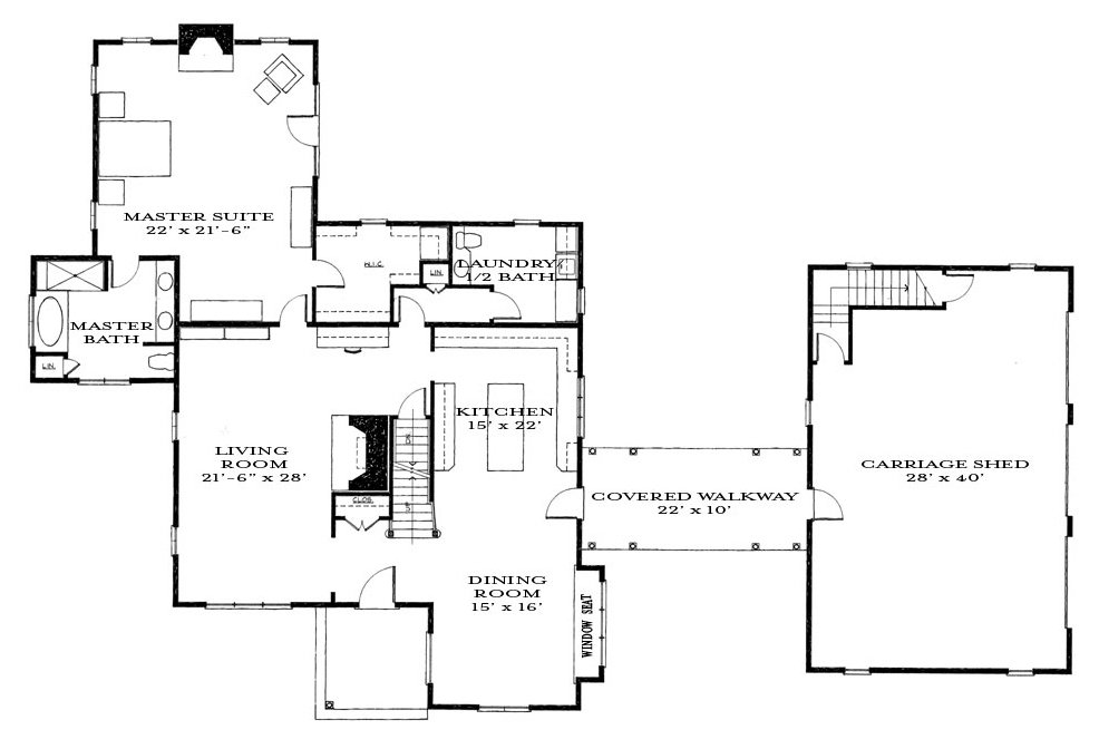 The kitchen area is open to the dining room. There is a nice size living room with fabulous fireplace. Towards the back of the house is the master suite as well as a laundry and half bath. Then you can follow the covered walkway to the carriage shed, which gives you so many options! Perfect as a guest suite, studio, etc.