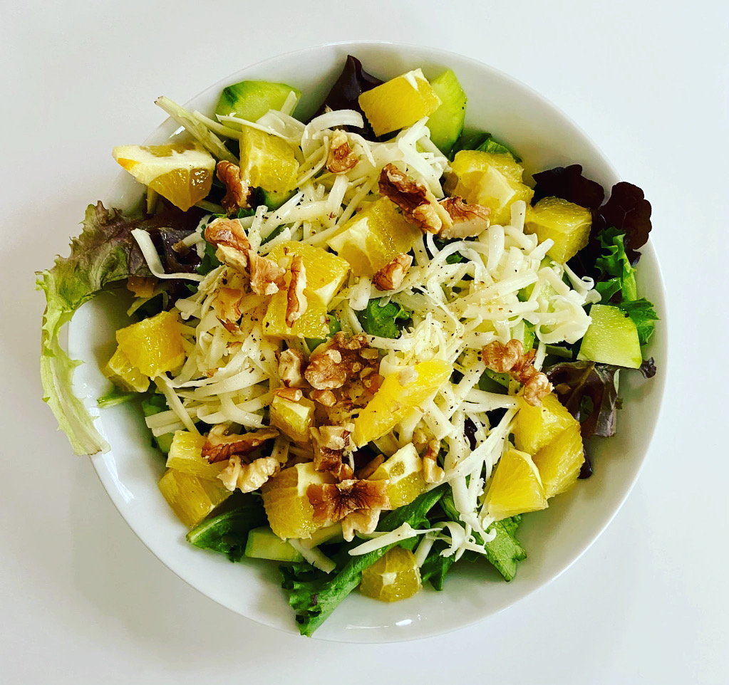 I just used a few handfuls of organic lettuce, chopped orange pieces, chopped walnuts (any nut will do), and some shredded Monterey Jack. My vinaigrette: In a little dish I swirled about the amount of olive oil I would use, then added a splash of white wine vinegar and the juice from a slice of the orange. I also added a tiny squeeze of honey and a few shakes of pepper, whisked it up and drizzled over the salad.
