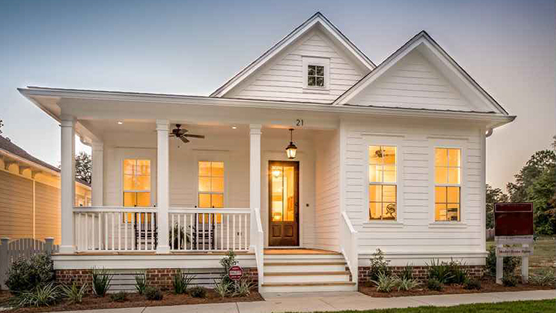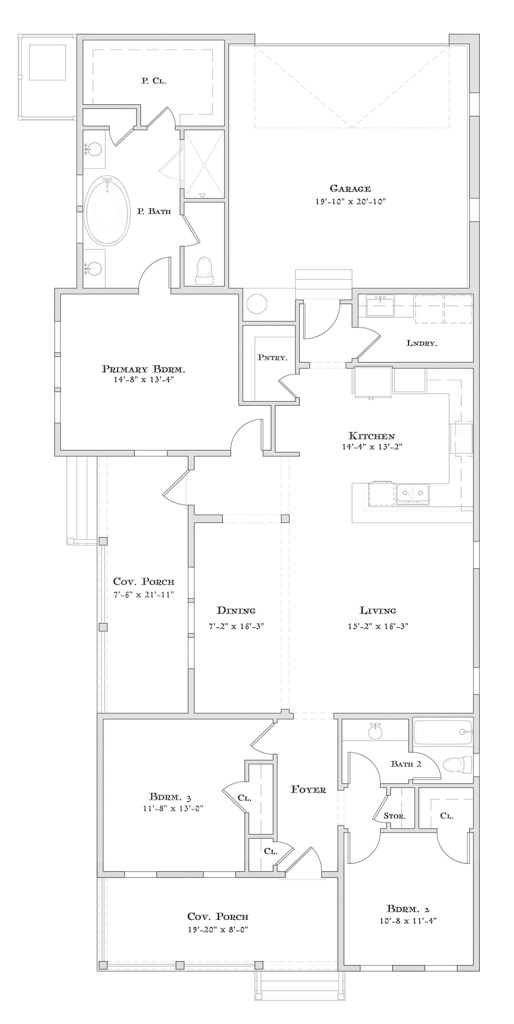 The front of this home has two bedrooms with a nearby bathroom. After passing the bedrooms you walk into the open living/dining/kitchen area with a covered porch which keeps the living space more private. Note the pantry in the kitchen (what a dream!) The primary bedroom is in the back left, complete with a wonderful bathroom and closet. The laundry is near the back door that heads to the garage – tucked out of the way, yet close to the primary bedroom for convenience. So much charm!
