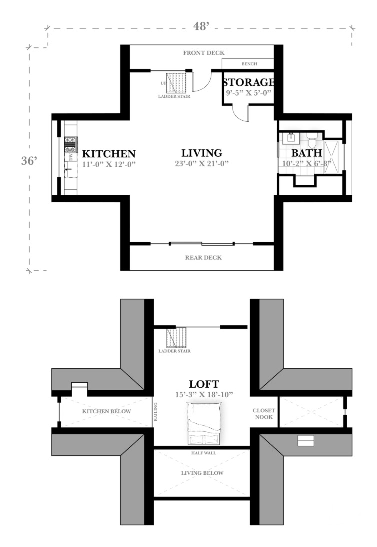 This plan has living and kitchen downstairs along with a full bathroom and storage area. Upstairs you’ll find the loft (via ladder stairs) with a closet nook.
