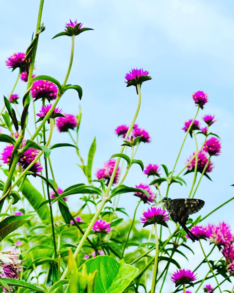 I love to be out and about and spot something cool – grab my phone and get a snippet. These flowers were beautiful against the sky, and their color, whoa! I love fuchsia – such a vibrant color. The butterfly was zipping around, I waited for him to land and get comfy before taking the pic. #alwayslookup