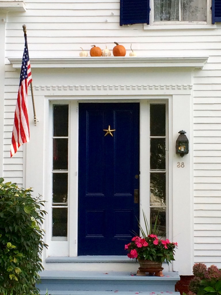 Isn’t this the quintessential New England fall decor you’ve always dreamed of? Simple. Classic. The gorgeous blue of the door, coupled with the classy door knocker is enough to say WOW, but add pumpkins on the ledge above the door and this is a knockout! The American flag dresses this off nicely, as does the pretty flowers on the porch.