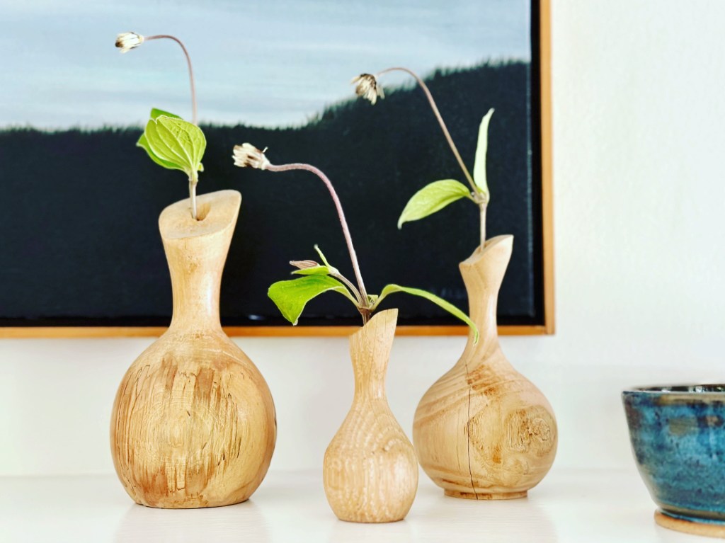 ✨Pictured above, three wooden vases that my dad made me❤️, a painting by Sylvia Alberts and pottery from The Swag by Stonehouse Pottery