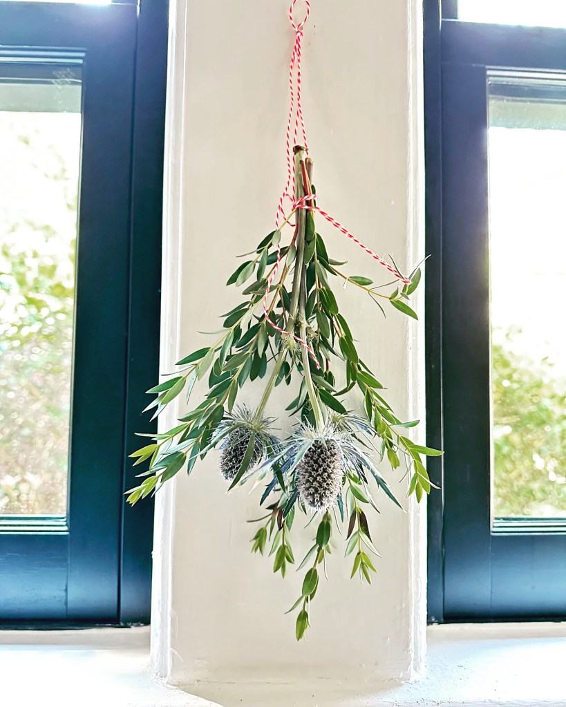 Love this! I hang a plain green wreath between my kitchen windows for the Christmas season, because my mom always did. I’ve never thought of doing what you’ve done. Do you by any chance know the name of the greens? And I think the other might be large thistle? Thanks for sharing your zingy idea!