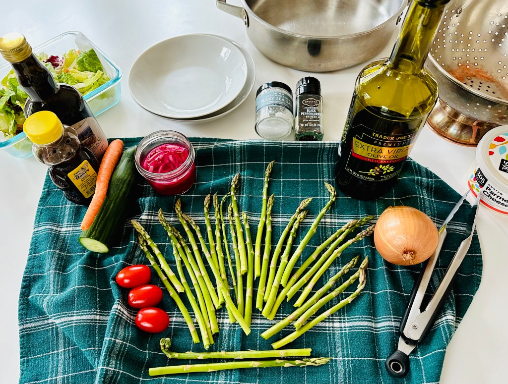 What did I forget? Pasta. Good grief, a major component of this meal. This is the asparagus pasta recipe that we’ve had so many times for dinner (along with a salad). We love it. We try to have several meatless days each week.