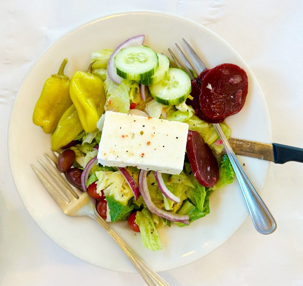 Funny thing, we were recently in Michigan visiting family. We ran to a cool pottery place (more on that in a future post) and passed this fabulous restaurant on the way home. We love Greek food but some places are far better than others and this is one of those places. We were there early and quickly the restaurant filled up with people. It was a weekday, most all were older, gathering around and having a good time. I loved seeing what they ordered, everything looked fabulous – including the “oompah cheese” as I used to call it, which is SO fun and delicious – I didn’t order it this time, but it was fun to watch.