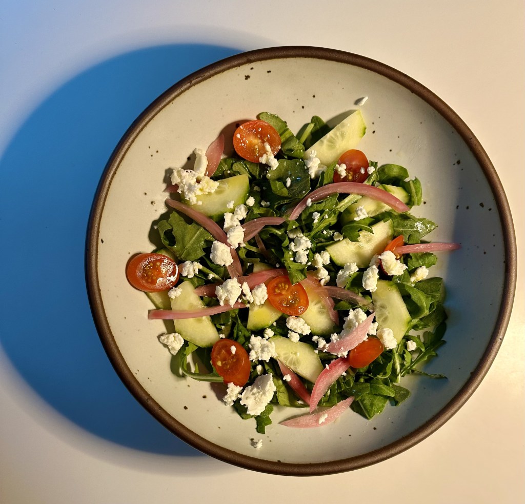 I made an arugula, goat cheese, pickled red onion, tomato and cucumber salad and dressed it with the Lusty Monk Vinaigrette (recipe from their website). Their description of this recipe “A vinaigrette with an extra kick, compliments of the Inglis/Diem family! This vinaigrette goes well on salads, veggies, and anywhere you’d use a balsamic vinaigrette. It has a lovely extra pop from the mustard, the pepper flakes and the hot sauce, and has a nice balance.”