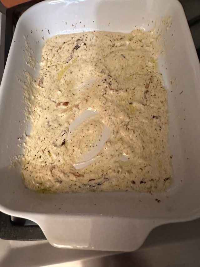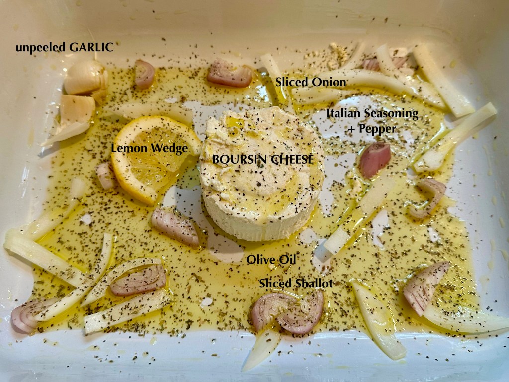 I use a lasagna size pan, drizzle a good bit of olive oil and coat the pan. Then add the Boursin cheese (after you remove it from the foil wrapper 😂), sprinkle the onions and shallots around. Add a wedge of lemon and sprinkle with seasonings. Now drizzle with olive oil. I give it a good drizzle, it’s good for ya! THAT’S IT!