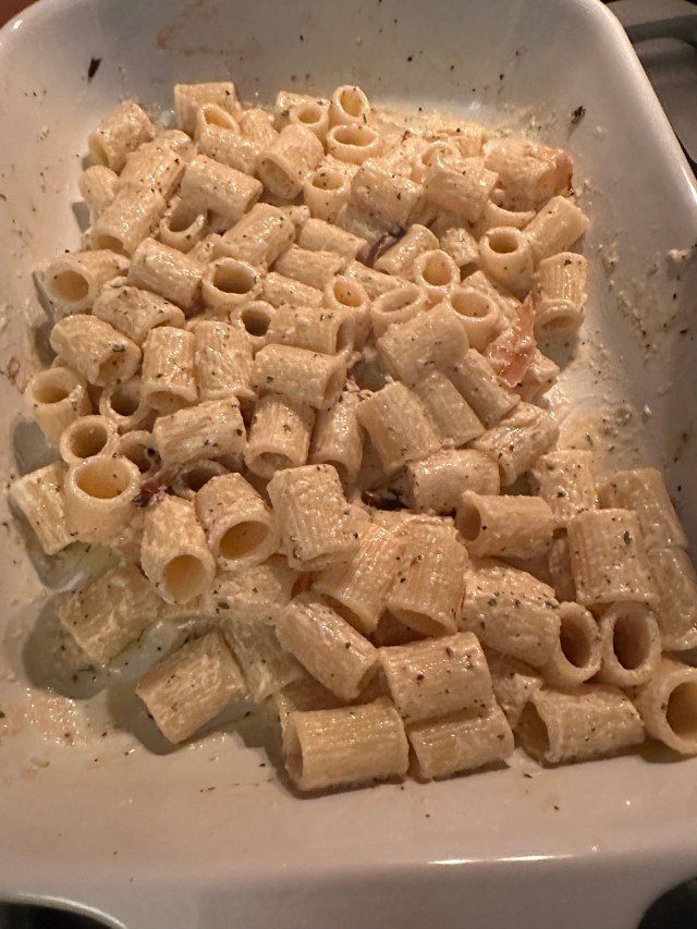 TRY THIS! If you haven’t jumped on the Boursin pasta train yet, here’s a great opportunity to do so. I’ve tried many renditions, one I’ve shared (with spinach and tomatoes) but I wanted one quicker to make but every bit as tasty. Bingo! This fit the bill. It was perfection in every bite. This make enough for two good portions with a little leftover. So adjust the amounts for more people. It reheats well!