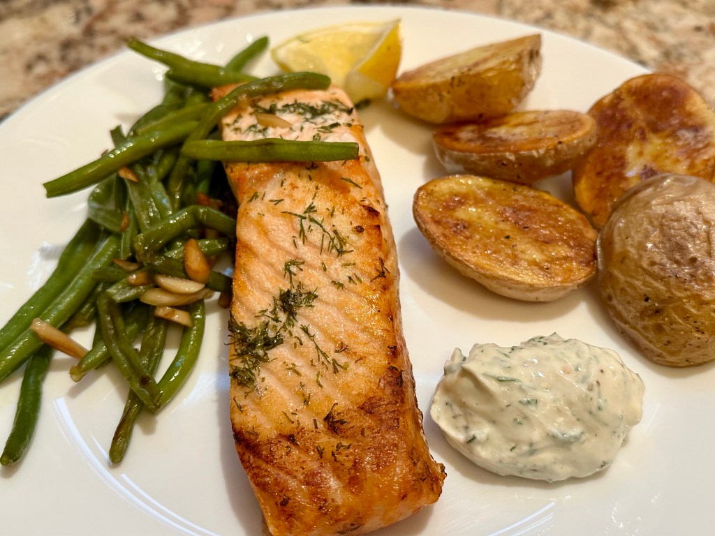 New year, new you, right? Salmon is healthy and so popular right now. But, how do you prepare it if you aren’t a salmon fan in the first place? See recipe below, it’s tasty (but not salmony), has a great homemade (healthy) mustard dill sauce, sautéed green beans with almonds AND the best roasted potatoes EVER. Here goes…