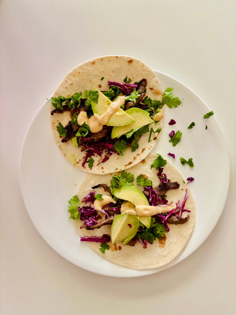 When done, heat your tortillas (flour or corn), add the beef slices, avocado, cabbage, cilantro and a squeeze of lime. You can also use a chipotle mayo or Yum Yum sauce (from the grocery store unless you have time to make your own). My husband had 2 tacos, I had one, and with the two small pieces of steak left in the pan, I just topped it with avocado, purple cabbage, cilantro and lime – no sauce. Wow, delicious. There is SO MUCH FLAVOR in the meat!
